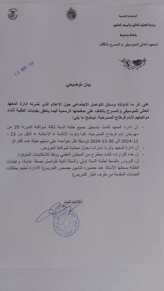 تعلم ادارة المعھد العالي للموسيقى والمسرح بالكاف ان الدروس تتواصل بصفة عادية بالنسبة لطلبة السنة الاولى والسنة الثانية مسرح للفترة المتراوحة بين 25 و 29 نوفمبر 2024 .